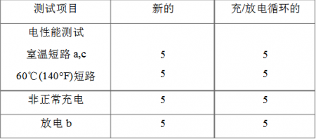 5.1.1技師更換型鋰電池應(yīng)當(dāng)按10-19節(jié)要求測(cè)試, 其中11B節(jié)(強(qiáng)制放電試驗(yàn))僅適用于電芯用于電池組的場(chǎng)合, 對(duì)多電芯安裝, 見5.3.1,按10節(jié)短路試驗(yàn)要求,不應(yīng)當(dāng)發(fā)生起火或爆炸,以及14A節(jié)沖擊試驗(yàn),15節(jié)微振試驗(yàn), 18B節(jié)熱循環(huán)試驗(yàn)或18C節(jié)高度摸擬試驗(yàn)不應(yīng)當(dāng)發(fā)生起火或爆炸。另 外在進(jìn)行短路試驗(yàn)時(shí),電芯或電池殼體溫度不應(yīng)超過150°C (302F)。
